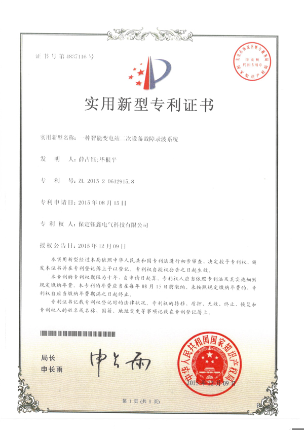 一種智能變電站二次設備故障錄波系統實用新型專利證書