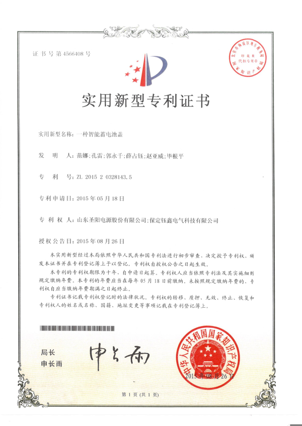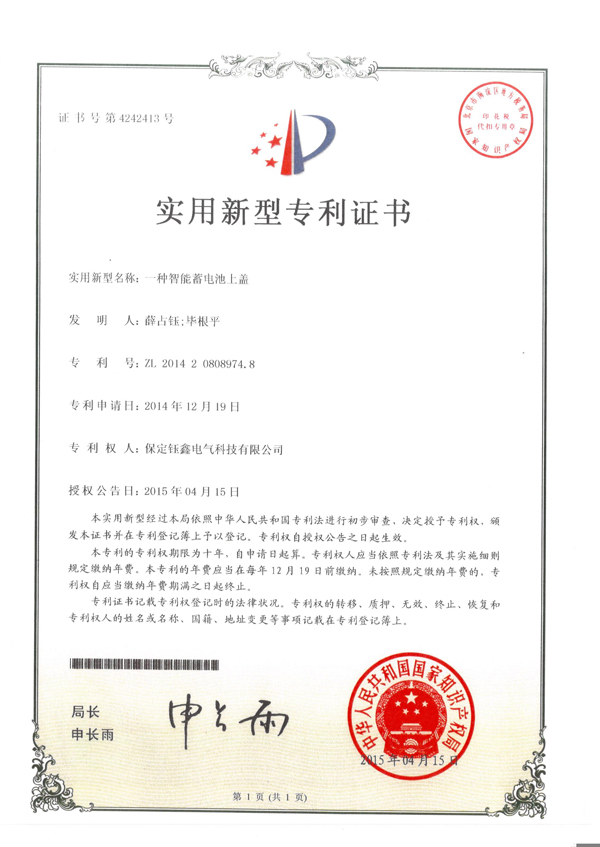 一種智能蓄電池蓋實用新型專利證書
