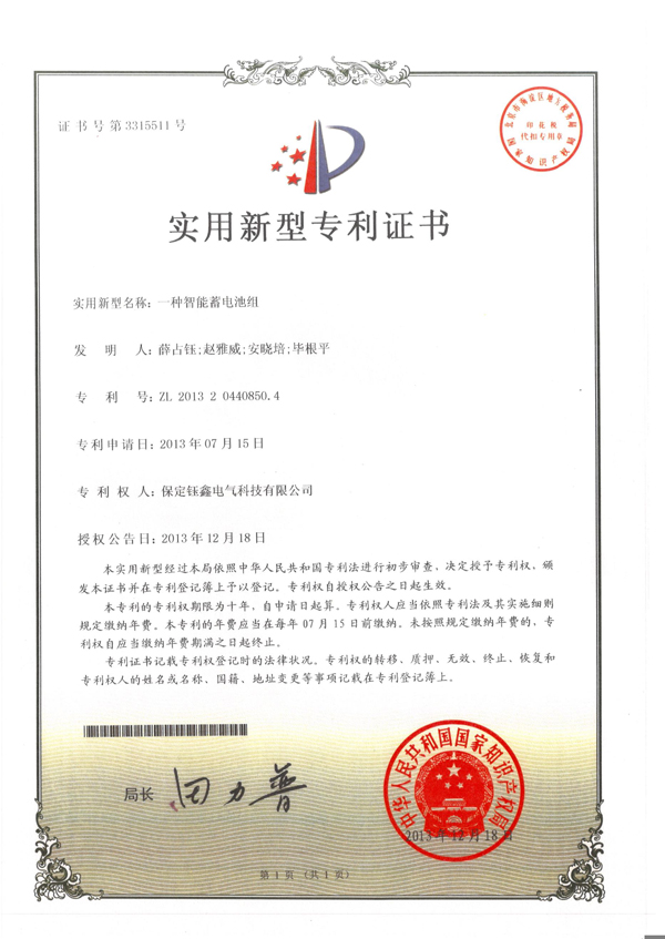 一種智能蓄電池組實用新型專利證書