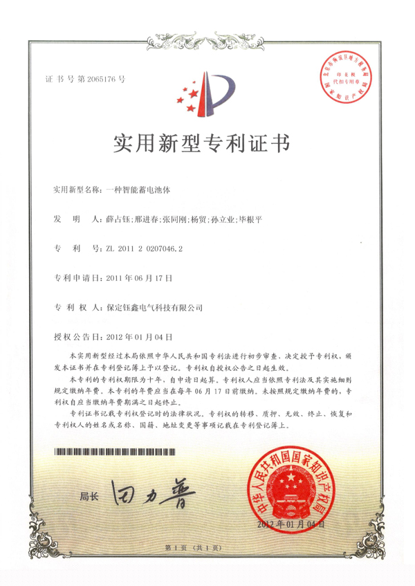 一種智能蓄電池體實用新型專利證書