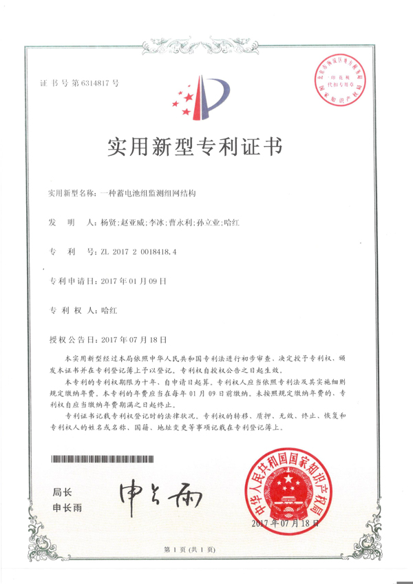 一種蓄電池組監測組網結構實用新型專利證書