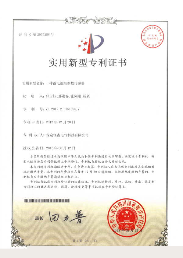 一種蓄電池組參數傳感器實用新型專利證書