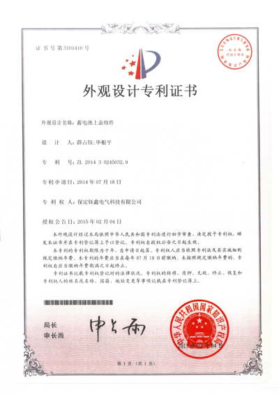 蓄電池上蓋組件外觀設計專利證書