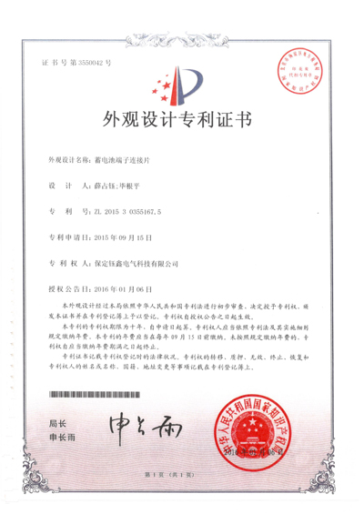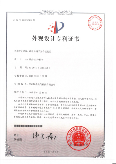 外觀設計名稱:蓄電池端子連接片套件,專利號:ZL201530003450.1,專利申請日:2015年01月07日,專利權人:保定鈺鑫電氣科技有限公司,授權公告日:2015年07月15日