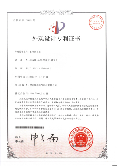 蓄電池上蓋外觀設計專利證書