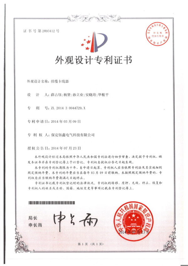 排纜卡線器外觀設計專利證書